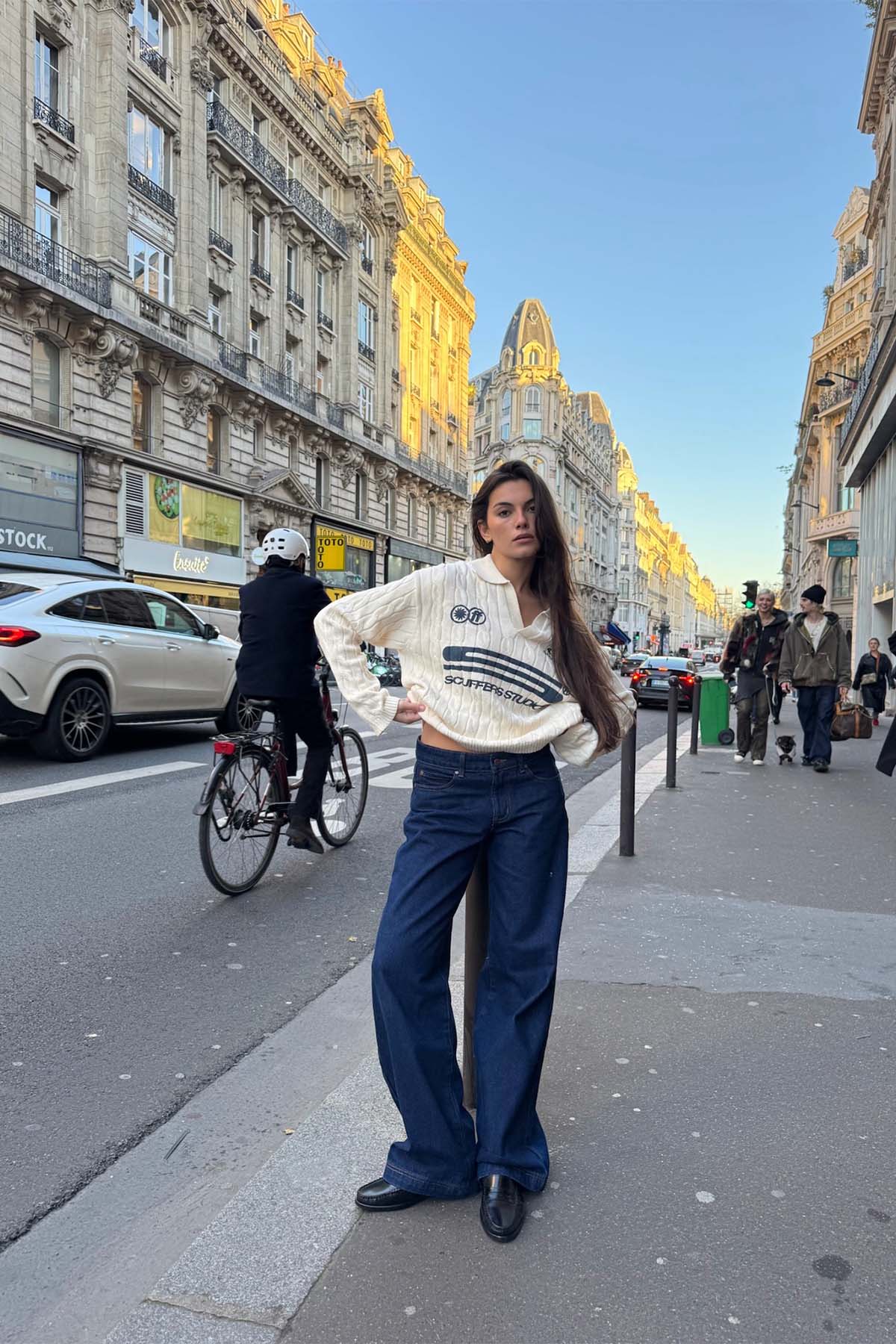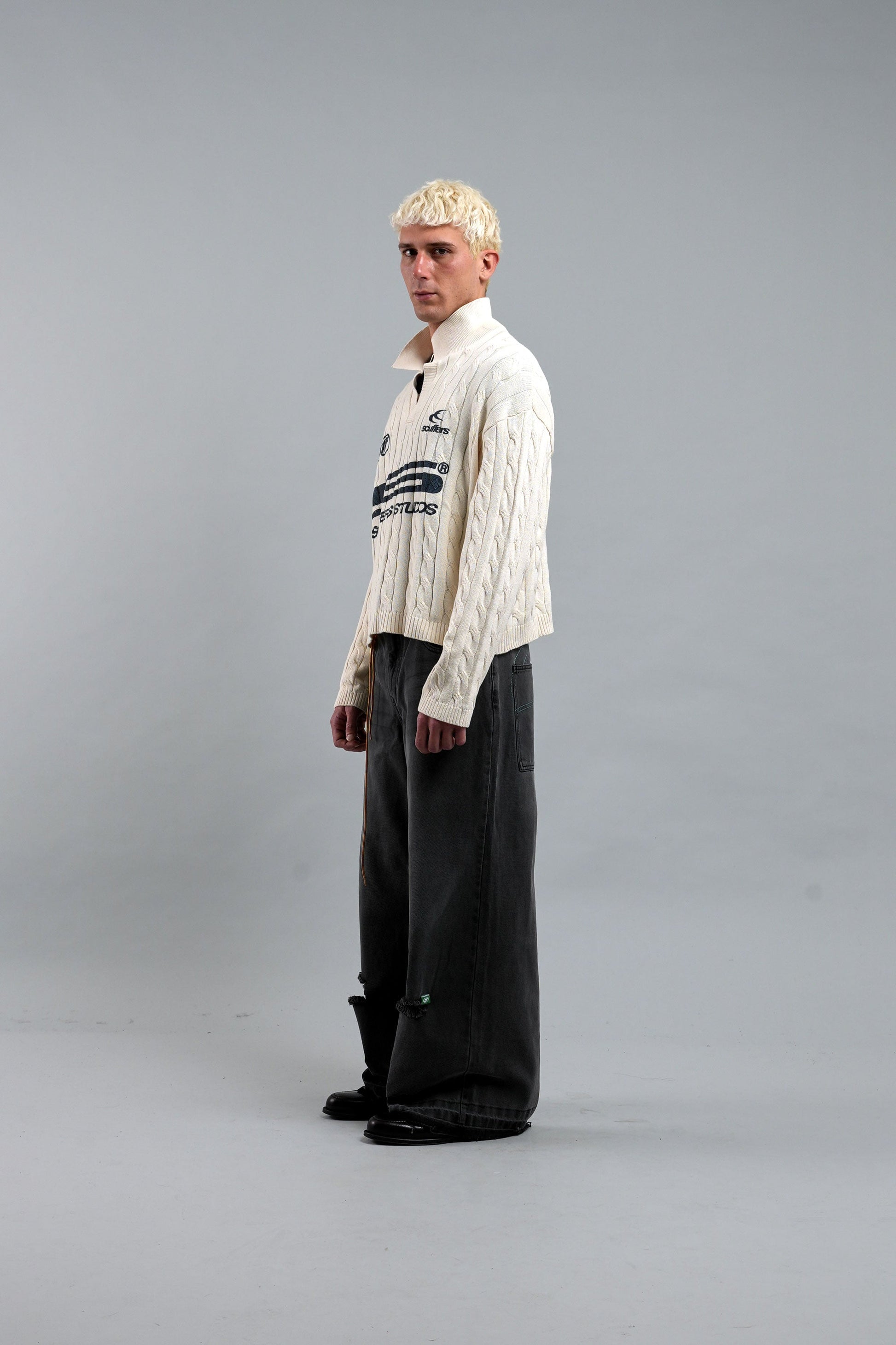 Dieser ecrufarbene Trench-Strick-Polopullover aus weicher, atmungsaktiver Baumwolle bietet hohen Tragekomfort. Er besticht durch sein strukturiertes Zopfmuster, einen Kragen mit V-Ausschnitt und gerippte Bündchen an Ärmeln und Saum. Markante, marineblaue Logos und Schriftzüge auf der Vorderseite setzen einen kontrastierenden Akzent und verbinden klassische Ästhetik mit modernem Branding. Ideal zum Kombinieren mit anderen Kleidungsstücken oder solo getragen.
